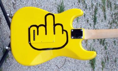 | Have fun with your audience with this completely "Off the Wall" Finish! Happy on one side, and down right rude on the other! Just send us your "bolt on neck" Guitar or Bass Body (no hardware or electronics) and we will finish it in this style! * Guitar and Bass Bodies with binding extra. Contact us for more details. |